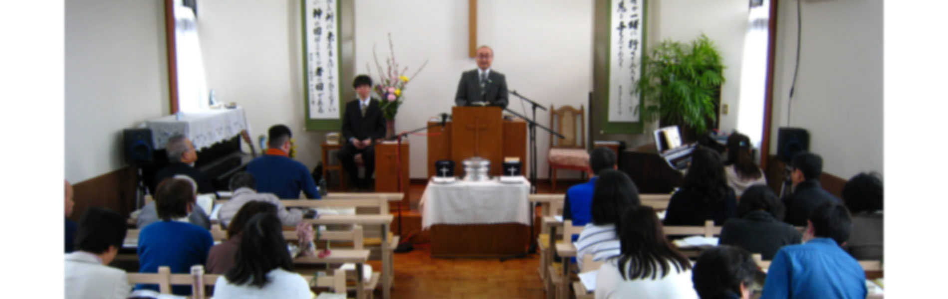 子どもも大人も一緒に礼拝しています。小さなお子様の様子によっては礼拝堂の後ろのお部屋で過ごしていただくことができます。